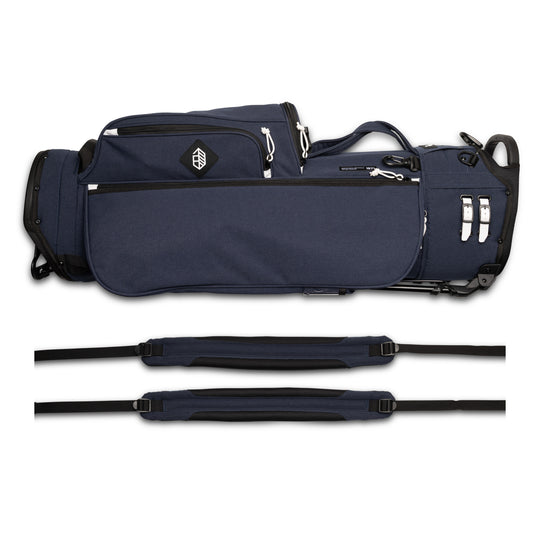 Designed with a versatile single or double shoulder strap configuration the Trouper 3.0 is your ideal companion on the course. A large insulated front cooler pocket has enough space to keep four 16oz cans cold. The two newly improved fleece-lined valuable compartments and seven-pocket design secures valuables while allowing for straightforward access. A large five-way divider allows for simple organization and an easy pull for all 14 clubs even with oversized grips. Simply put the Trouper 3.0 delivers an effortless and reliable experience for any player round after round. Featuring All-New Straps and a bolstered stand mechanism.